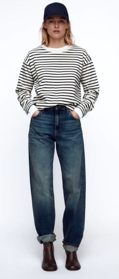 La primera prenda es esta camiseta de rayas de Zara, una prenda simple, pero que nunca pasa de moda. Es una prenda con cuello redondo y manga larga, disponible desde la talla S hasta la talla XL. Recuerda que hay una guía de tallas en la página web que te dará más detalles.