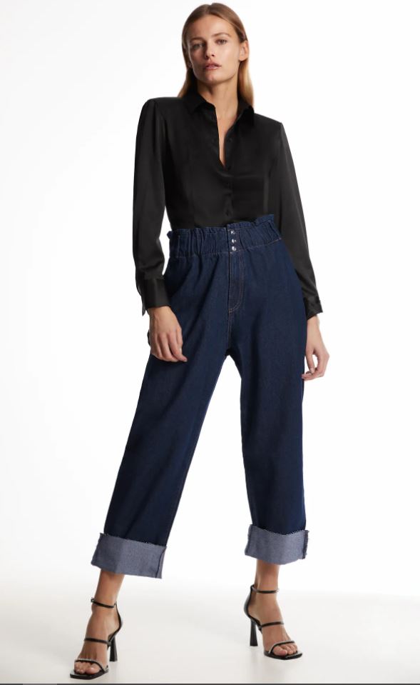 Ahora veremos el body satinado de la compañía insignia de Inditex. Es un body de color negro, con cuello solapa, hombreras y manga larga. Además, tiene un cierre frontal con botones y con botones a presión en bajo.