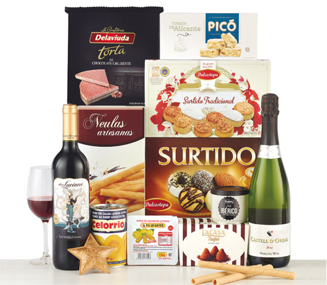 El segundo lote de Carrefour mejora un poco el anterior. Tiene una botella Castell D´Ordal y una botella de vino D.O don Luciano. En cuanto a los turrones, tenemos una tableta de turrón de Alicante Picó y una de turrón de chocolate. Además, hay un escuche de surtido tradicional de mantecados, un estuche de galletas, otro de neulas artesanas y otro de trufas al cacao.