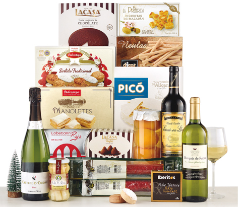 Subimos la apuesta con el tercer lote. Hay tres botellas, una de Castell D´Ordal, una de vino Valdepeñas y otra de vino Marqués de Rocas. En cuanto a los turrones, hay uno de Alicante Picó y otro de chocolate crujiente Lacasa. Asimismo, tenemos un estuche de mantecados y polvorones, uno de manoletes y otro de figuritas de mazapán.