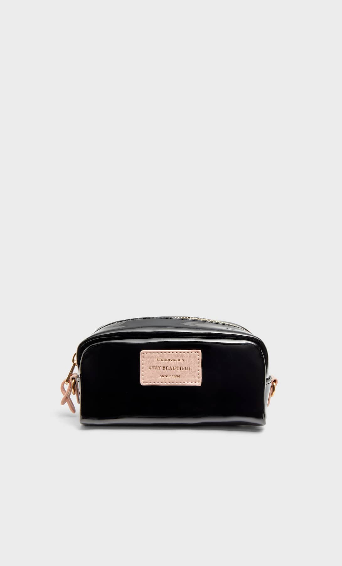 El último neceser de Stradivarius que te presentamos, es este en charol de color negro. Al igual que el primer monedero que te mostramos, este producto de almacenamiento personal ha utilizado un tipo de cuero que hacía un tiempo que no se usaba. El charol se encasilló en un estilo de vestimenta, y se dejó de usar.