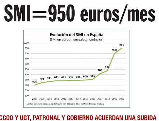 Yolanda Díaz, ministra de Trabajo y Economía Social ha declarado su intención de subir el Salario Mínimo. Aunque el debate está aún sobre la mesa y no se ha definido el porcentaje de ese aumento, los sindicatos UGT y CCOO exigen que se llegue a los 1.000 euros mensuales, que es lo que aparece establecido en la Carta Social Europea. Ahora mismo, según está recogido en el Real Decreto 231/2020, de 4 de febrero, el SMI es de 950 euros por mes, en catorce pagas, o 31,66 euros diarios, según como se haya fijado el salario en cada caso particular. Esta cifra es el resultado de una subida de un 5,5% en febrero de 2020. En 2019 el SMI experimentó un incremento del 22,3% y pasó de los 736 a lo 900 euros. El objetivo a día de hoy del Gobierno es llegar a un Salario Mínimo de 1200 euros antes de que termine la legislatura.