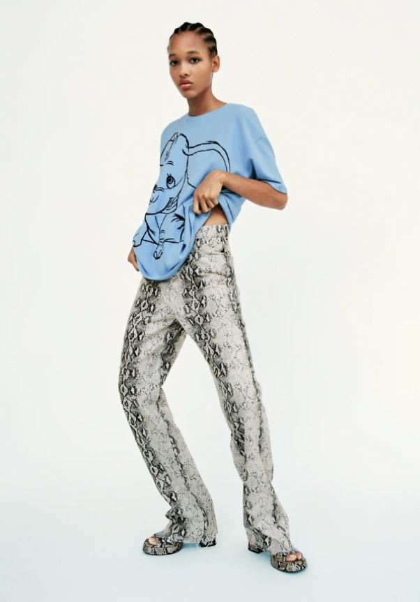 Ahora veremos esta camiseta de Dumbo de Disney de Zara. Es una camiseta azul de manga corta, con cuello redondo y un estampado del famoso Dumbo en color negro. La puedes encontrar en talla S, M y L.