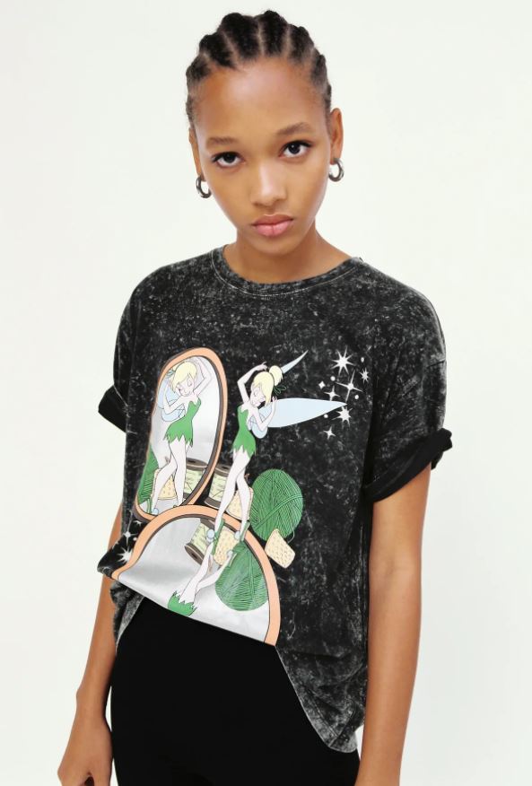 La siguiente prenda es esta camiseta de Campanilla, famoso personaje de Peter Pan, de Disney. Se trata de una prenda con cuello redondo y manga corto, siendo de color gris antracita y teniendo un dibujo de campanilla a todo color, destacando especialmente el verde.
