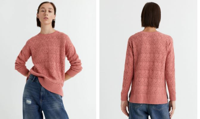 La marca española Sfera, a través de El Corte Inglés, nos presenta un jersey para mujer amplio, cómodo y que se adapta para ser combinado con cualquier prenda (falda o pantalón). Tejido en punto calado, variando armoniosamente formas de hojas abiertas y cerradas, en cuerpo y mangas, para dar un aspecto informal a la prenda. El cuello tejido en punto palo se adapta perfectamente, al igual que los puños en las mangas largas y pegadas. Cuenta con pequeñas aberturas laterales en el bajo del cuerpo.