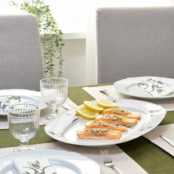 En primer lugar, y ya que se acercan fechas para cenar en familia, una fuente de la colección UPPLAGA. Se trata de una colección que saca a relucir tu lado romántico. Está formada por tazas, platos pequeños y grandes, los cuales tienen suaves bordes irregulares con motivos florales.
