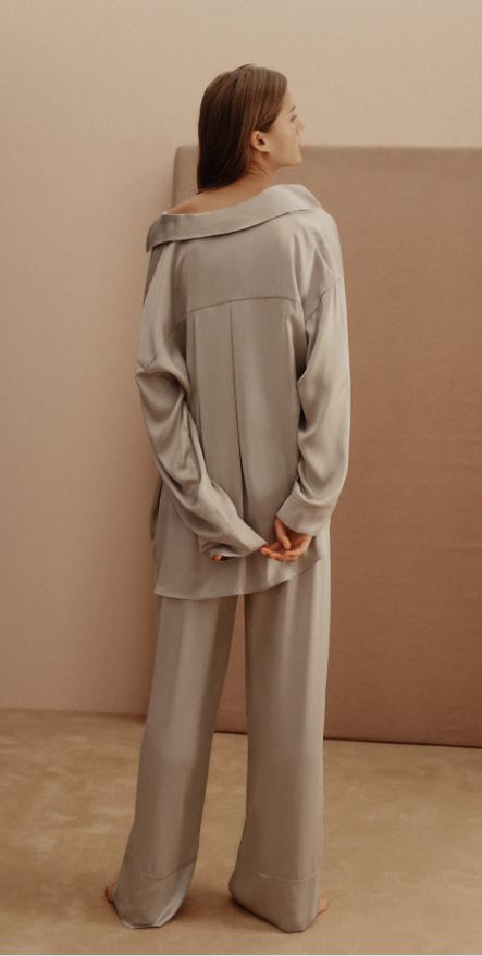 En cuanto a su pantalón, veremos también una prenda compuesta en un 92% seda morera y un 8% elastano. El pantalón tiene cintura con elástico en la espalda y unos prácticos cordones ajustables. Está disponible en tallas desde la S hasta la L, color gris y tiene un precio de 79,95 euros.