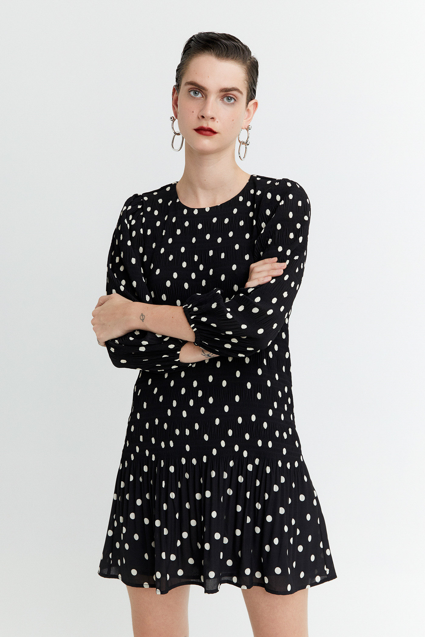 Este vestido en color negro tiene estampado de topos en color blanco. Un diseño de cuello redondo, corto con falda de vuelo plisada y mangas tres cuartos terminadas en elástico. El precio de este modelo de Sfera es de 25,99 euros, y lo puedes encontrar entrando en este enlace.