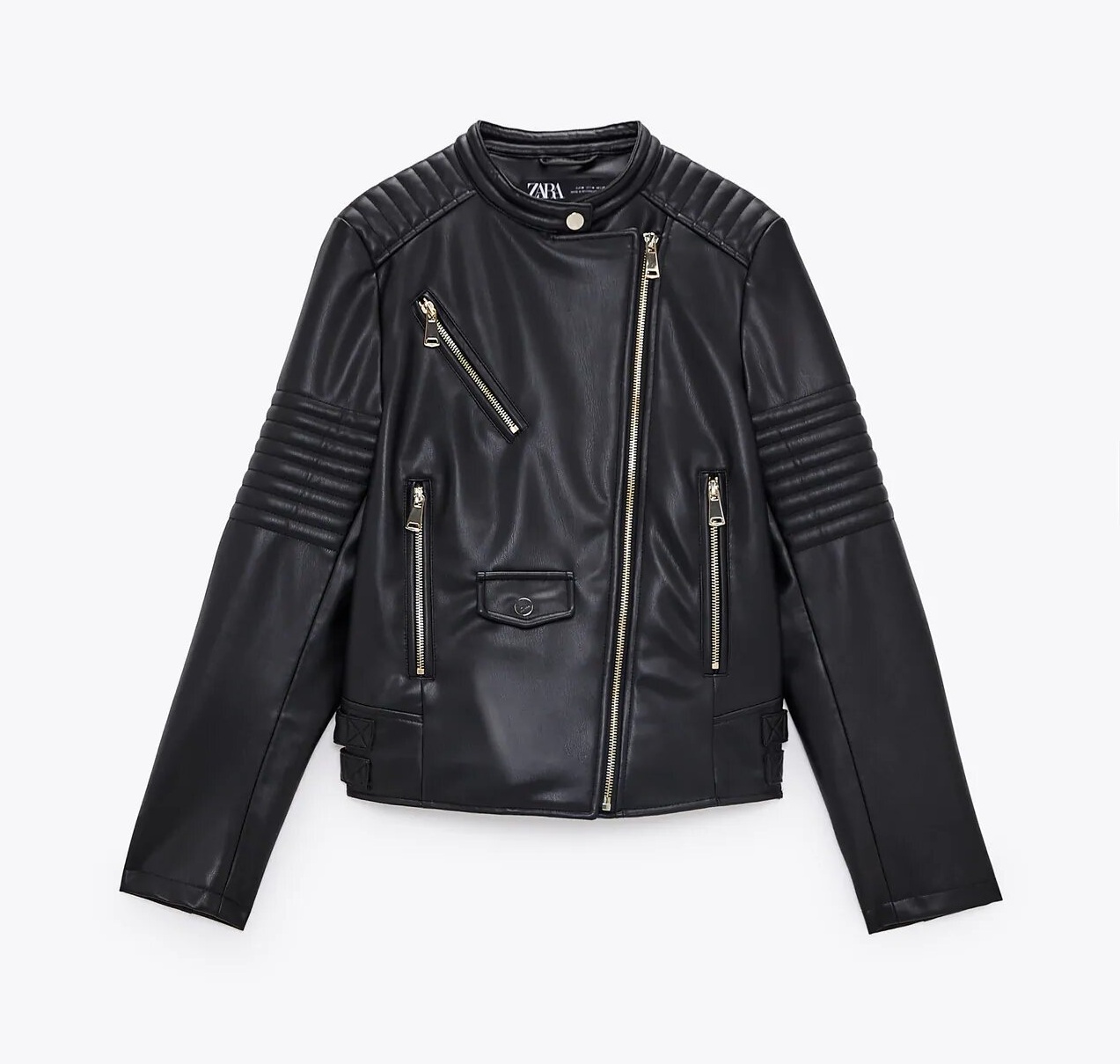 Este otro diseño de cazadora biker efecto piel de Zara se aleja un poco del diseño habitual de esta clase de prendas. Con este modelo no cabe duda de que podrás lograr toda clase de looks, no solo uno agresivo o uno elegante.