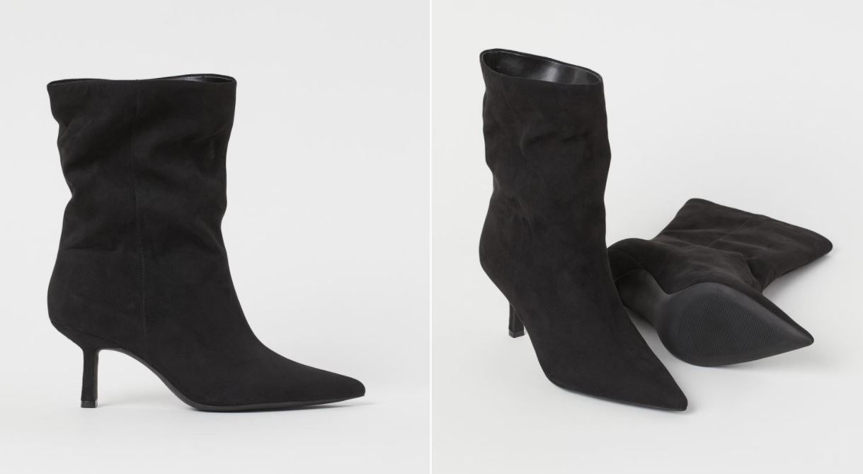 El negro se muestra como el color fetiche para la marca H&M para botas y botines. De toda la colección, al menos el 80% tiene como base el negro. Es elegante, sí, pero también algo lúgubre. Aunque se pueda combinar más fácilmente que otros tonos, sí que se echa de menos más variedad para dar un poco de color a la temporada otoño-invierno. Aquí presentamos unos de los pocos modelos disponibles en otro color, además de en negro: un botín de diseño clásico, con puntera fina, tacón bajo fino y revestido, y caña en suave poliéster ancha. El interior está forrado y puedes comprarla por menos de 30 euros en negro o bien en gris. Ojo, porque no cuenta con cremallera lateral.
