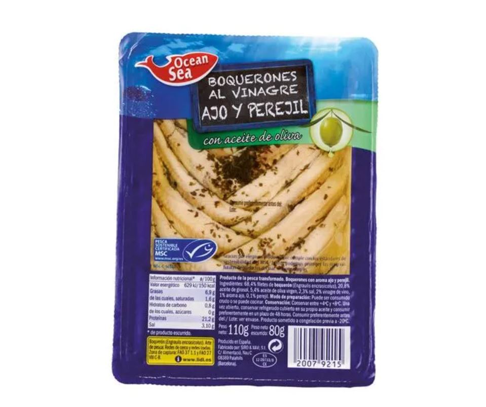 Lidl presenta también entre los productos con ofertas de esta semana boquerones frescos, en envase de 80gr de peso escurrido, bajo su marca Ocean Sean, sólo durante los días 21 y 22 de diciembre por 1,49 euros. puedes elegir entre dos variedades: con aceite de oliva, o en aceite de girasol con ajo y perejil, ricas ambas sin piel ni espinas.