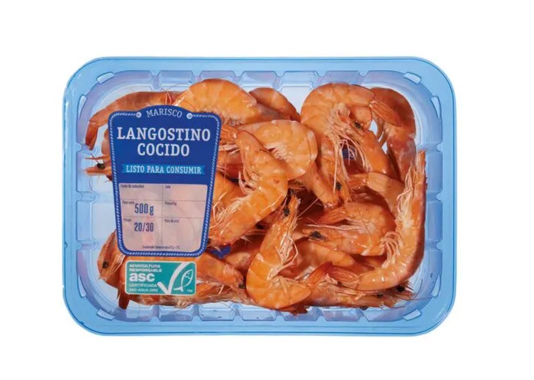 Listo para consumir, en gramaje de 500 gr, y sólo en los días 21 y 22 del mes 12, Lidl ofrece un gustoso langostino ya cocido a un precio de escándalo: 3,19 euros. Este crustáceo de color rosado, por estar cocido, presenta en estado crudo un color más pardo, con vetas amarronadas en forma de anillo un su cuerpo, que es lo comestible cuando quitamos el caparazón semiduro que lo protege. Puede encontrarse en mares de todo el mundo, y en aguas poco profundas.