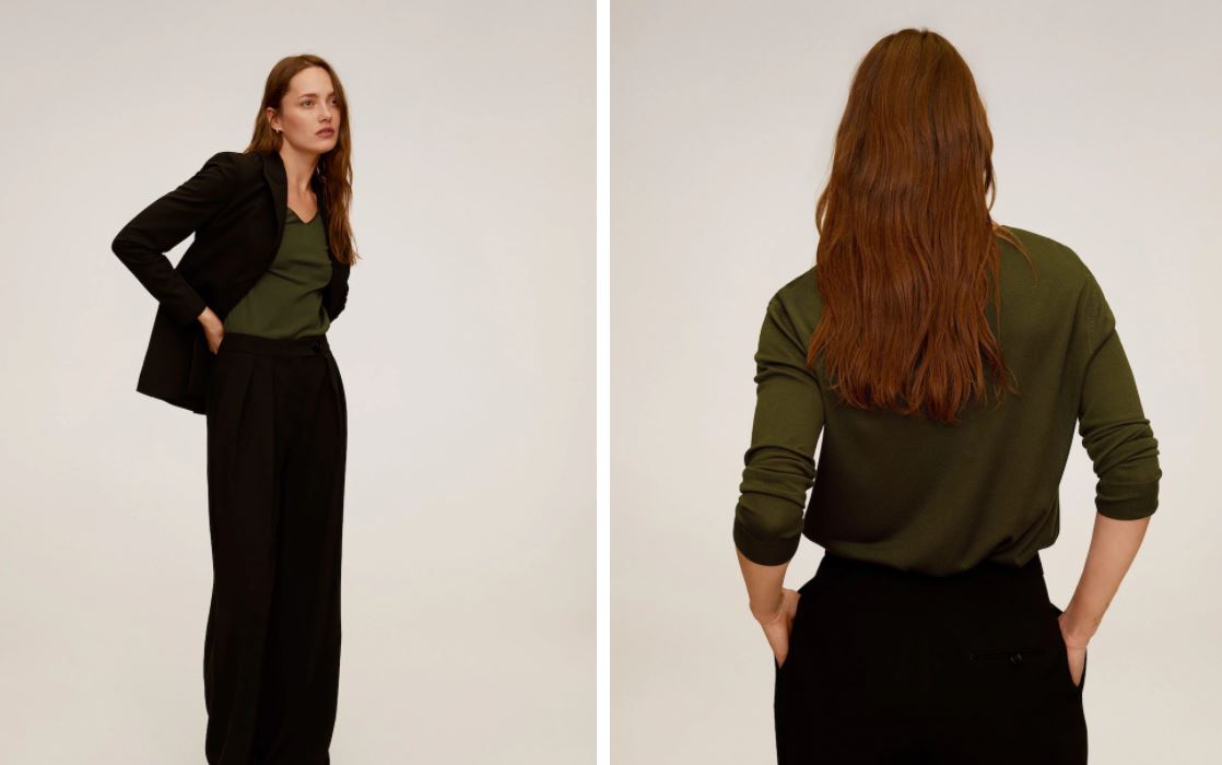 Mango se adapta con las últimas tendencias en sus creaciones a los distintos gustos y necesidades de la mujer actual con jerséis como este de color caqui.