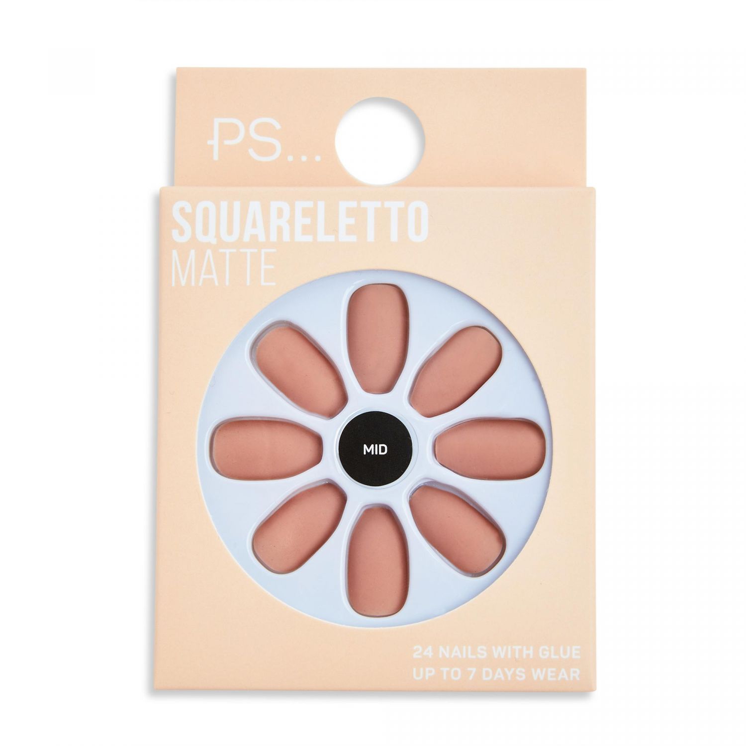 Un completo juego de uñas postivas de punta cuadrada en color nude de tono medio, que pega absolutamente con todo. Tan fáciles de poner y tan baratas que ya no tienes excusas para no lucir unas manos impecables.