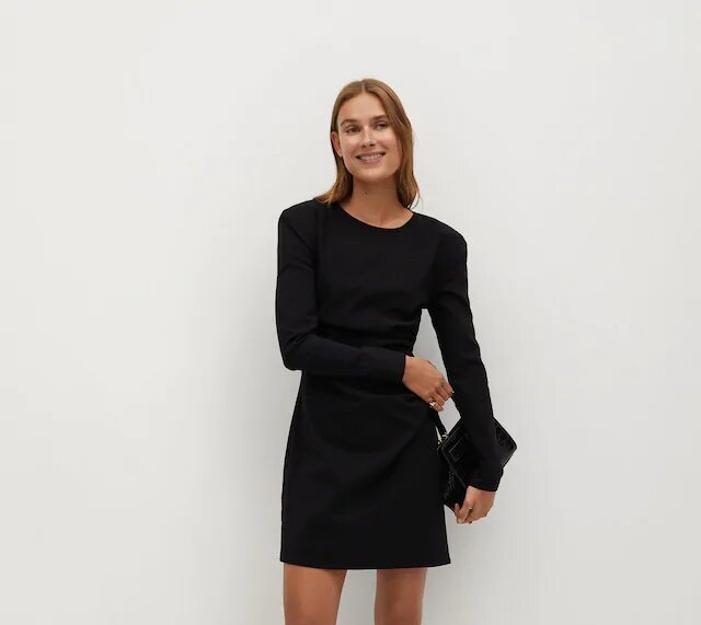 Para quienes prefieren ir un poco más abrigadas, en Mango puedes encontrar este vestido con manga larga que seguro se ajusta a lo que estabas buscando. Eso sí, sin dejar de lucir pierna, nada que no arreglen unas bonitas medias.