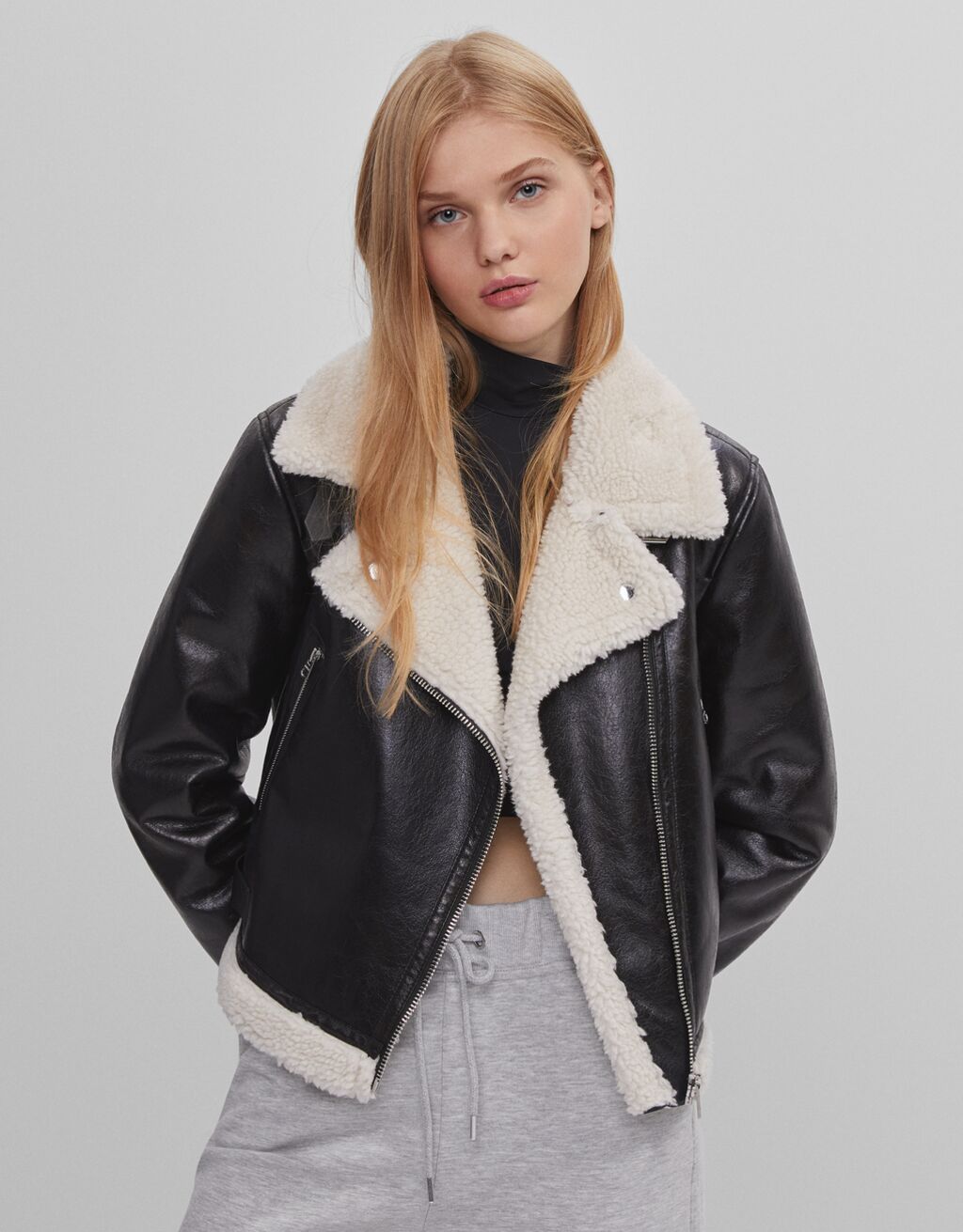 Al igual que la cazadora denim, también os mostramos otra cazadora de doble faz de borreguito. La diferencia en este caso, es que la prenda no es cropped, y el tejido es efecto piel en color negro.