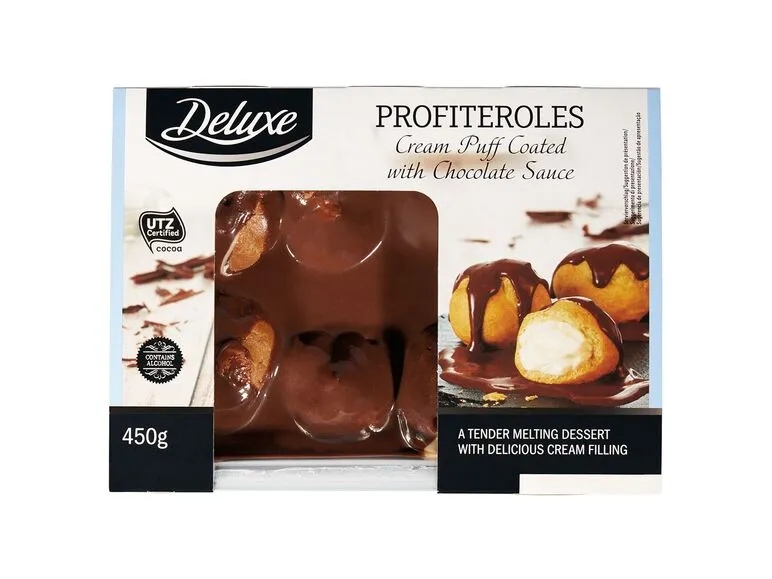 Por 2.99€ puedes adquirir una caja de 450 gramos de profiteroles Premium de Lidl Deluxe. Una receta tradicional que suele gustar bastante por su textura tierna y sus rellenos y acompañamientos de chocolate.