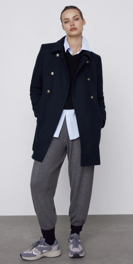 Ahora veremos este abrigo cruzado con lana de color marino. La prenda tiene cuello de solapa con manga larga y hombros marcados. Asimismo, tiene falsos bolsillos delanteros de vivo y cierre frontal cruzado con botones metálicos. Está disponible en talla XS y L.