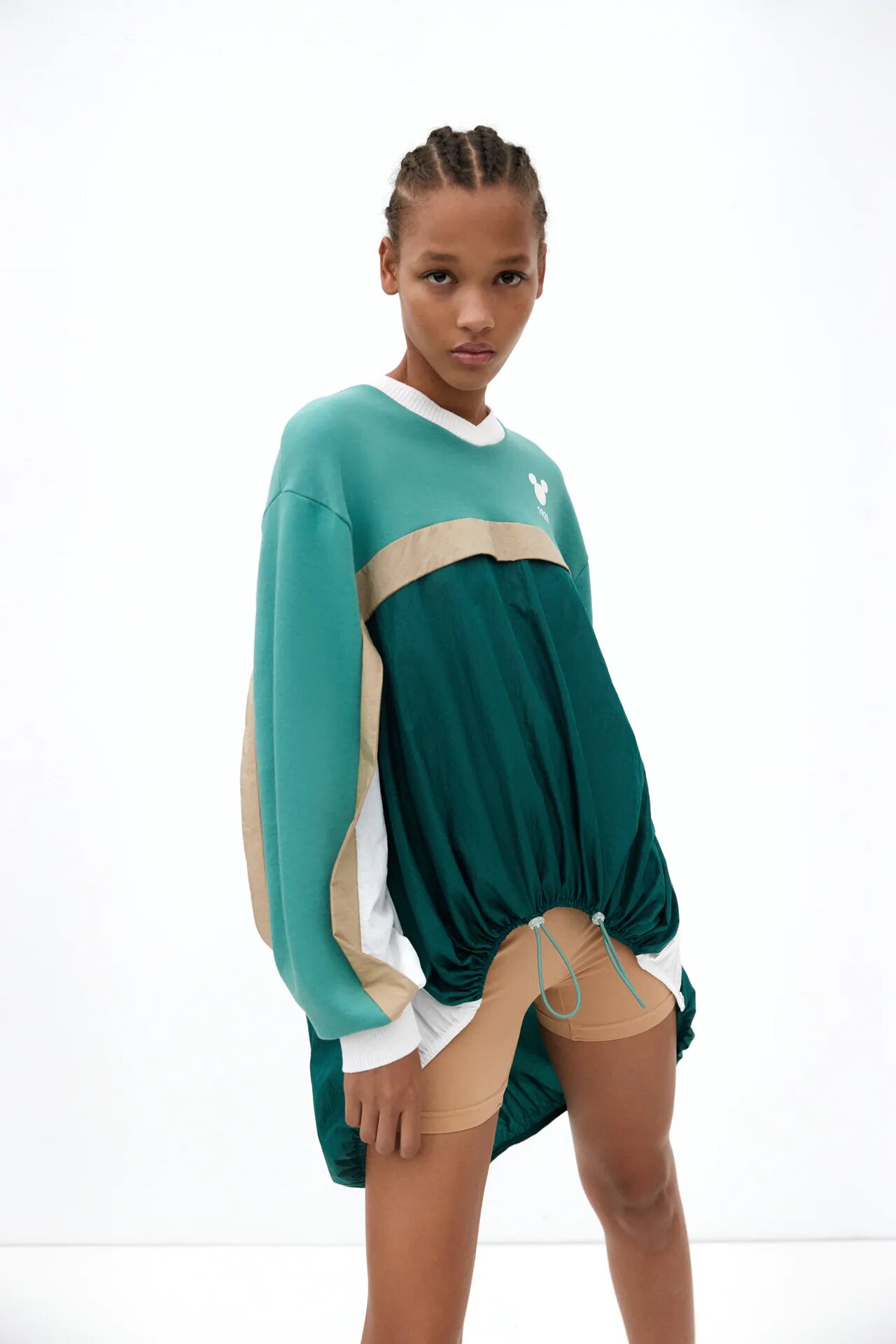 Esta sudadera en colores verdes y beige con detalles en blanco tiene cuello redondo. Tiene cuello redondo y manga larga combinada con puño acabado en rib de color blanco. Mickey Mouse aparece como un detalle de estampación con el año en el que fue estrenado el corto ‘Steamboat Willie’, el cual lanzó a este personaje a la fama. Este es el enlace donde podrás encontrar la prenda.