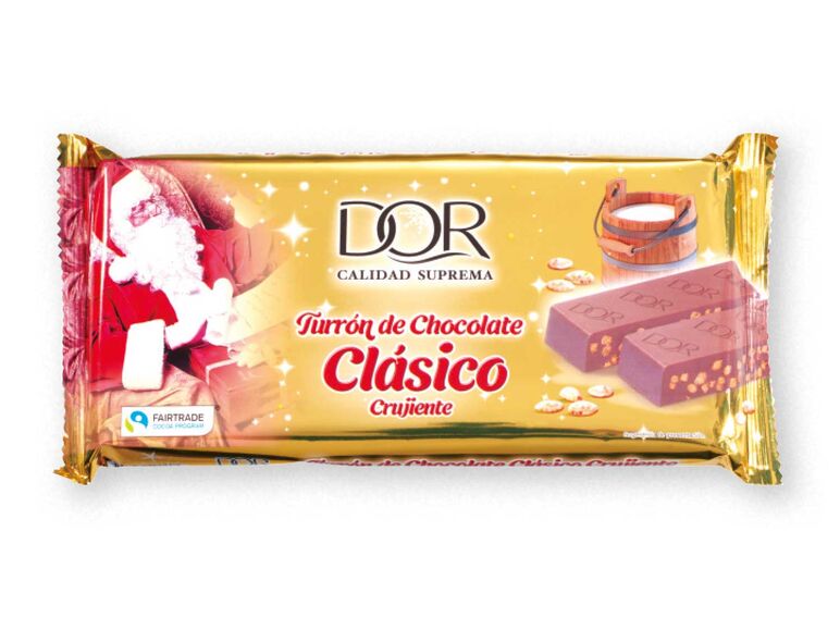 Aquí tenemos un turrón de chocolate clásico crujiente. Se trata del de toda la vida, sin florituras y sin nada extraño, simplemente un turrón clásico. Su precio suele oscilar entre 1 y 1,20 euros según la época del año por cada tableta de 250 gramos.