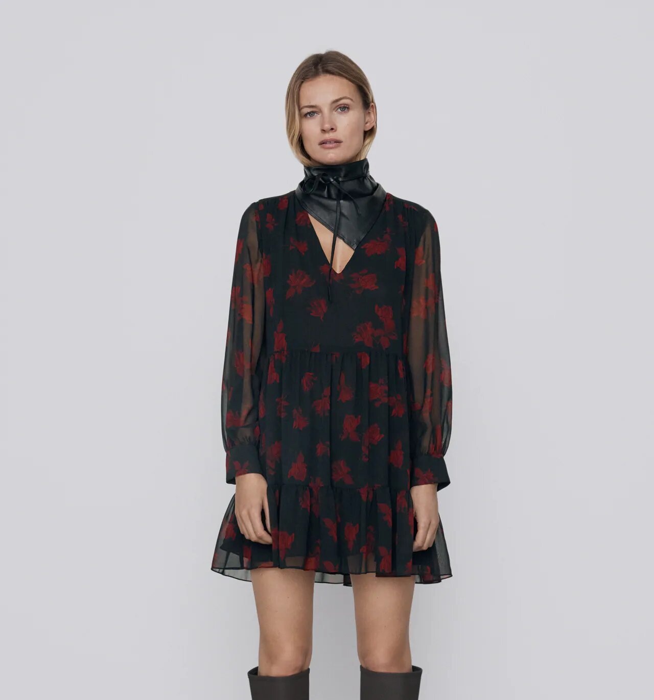 Se trata de un vestido de cuello de pico con manga larga de tejido semitransparente. Estampado de rosas y bajo acabado en volante. Su precio tras el descuento es de 17,99 euros. Este es el enlace donde podrás encontrarlo.