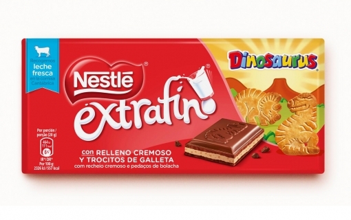 Puedes encontrar esta variedad de chocolate con un interior de cremoso relleno con trocitos de crujiente de galletas Dinosaurus.