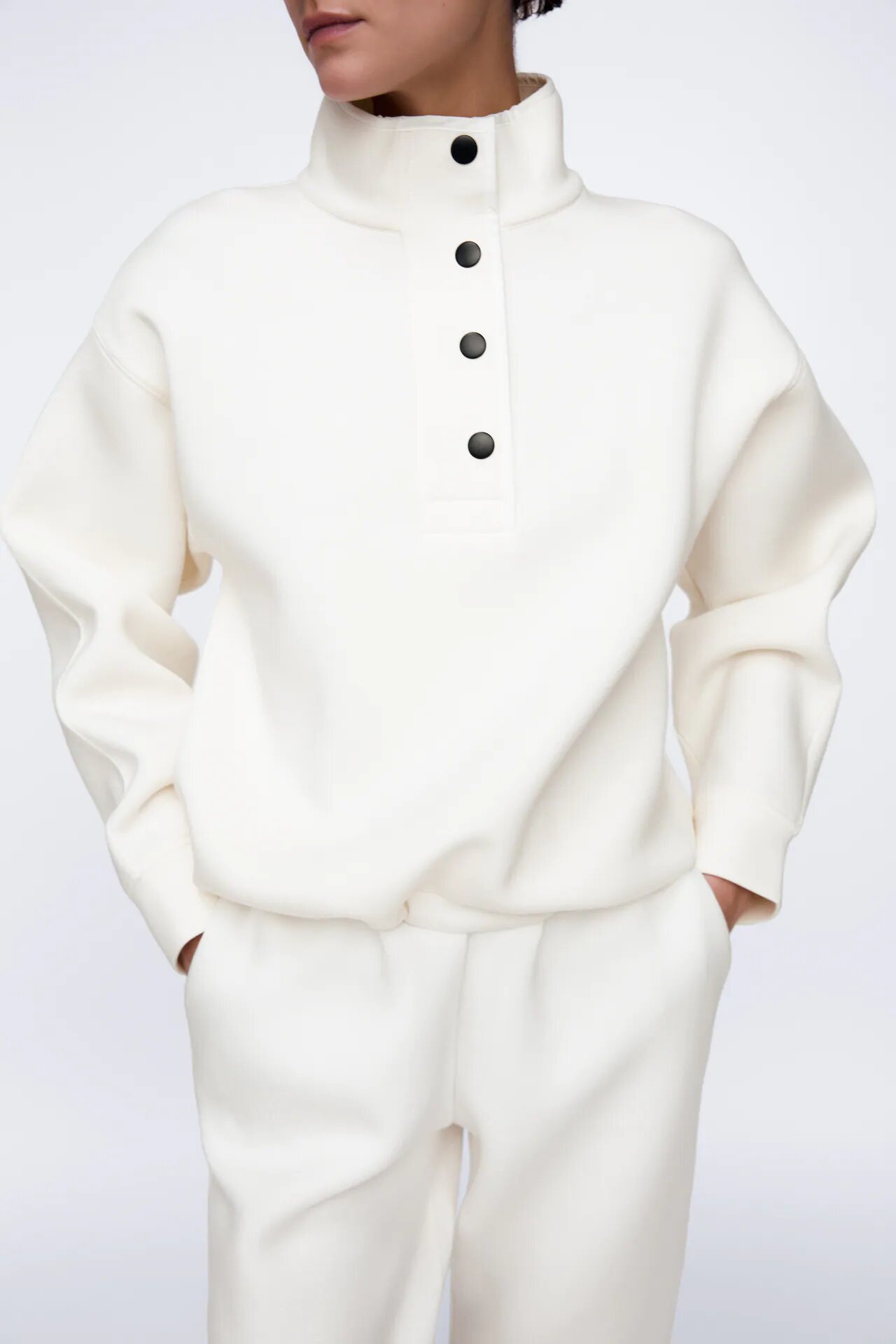 A diferencia de las anteriores sudaderas, como la básica, también carece de capucha. Tan solo está disponible en blanco roto.
