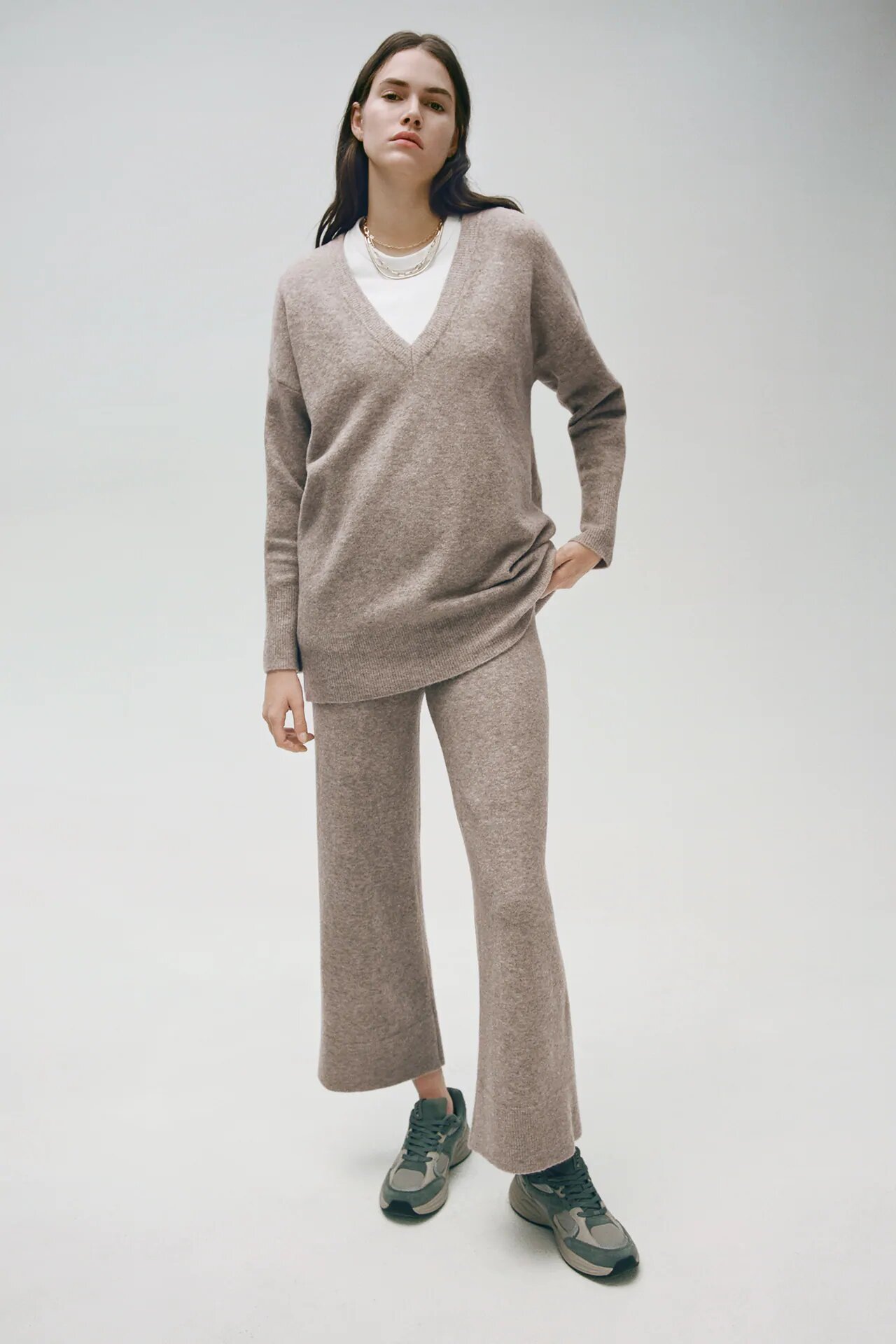 Se trata de un jersey de punto en color gris topo con cuello de pico y manga larga. Su precio es de 29,95 euros, y este es el enlace donde podrás encontrarlo.