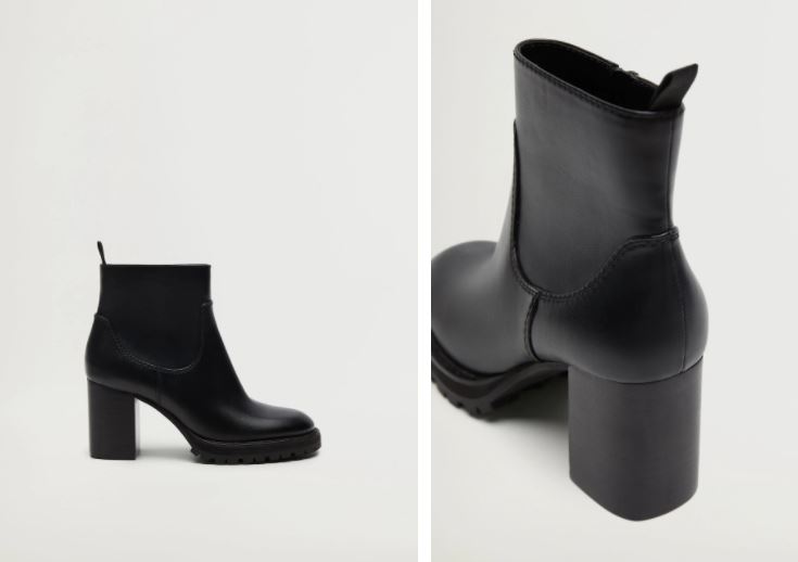 Por último, dejamos para el final el botín que más nos gusta de la colección de calzado femenino de Mango. Una bota de estilo abotinado, de punta redonda con tacón cuadrado de 8 cm de altura y cierre lateral de cremallera. El color negro azabache le da un plus de elegancia y su diseño caustico lo convierte en un calzado de lo más combinable. La suela también es de caucho y la suela pegada, aunque simule ser cosida. La caña se ajusta a las mil maravillas al pie y es algo más flexible que la horma.