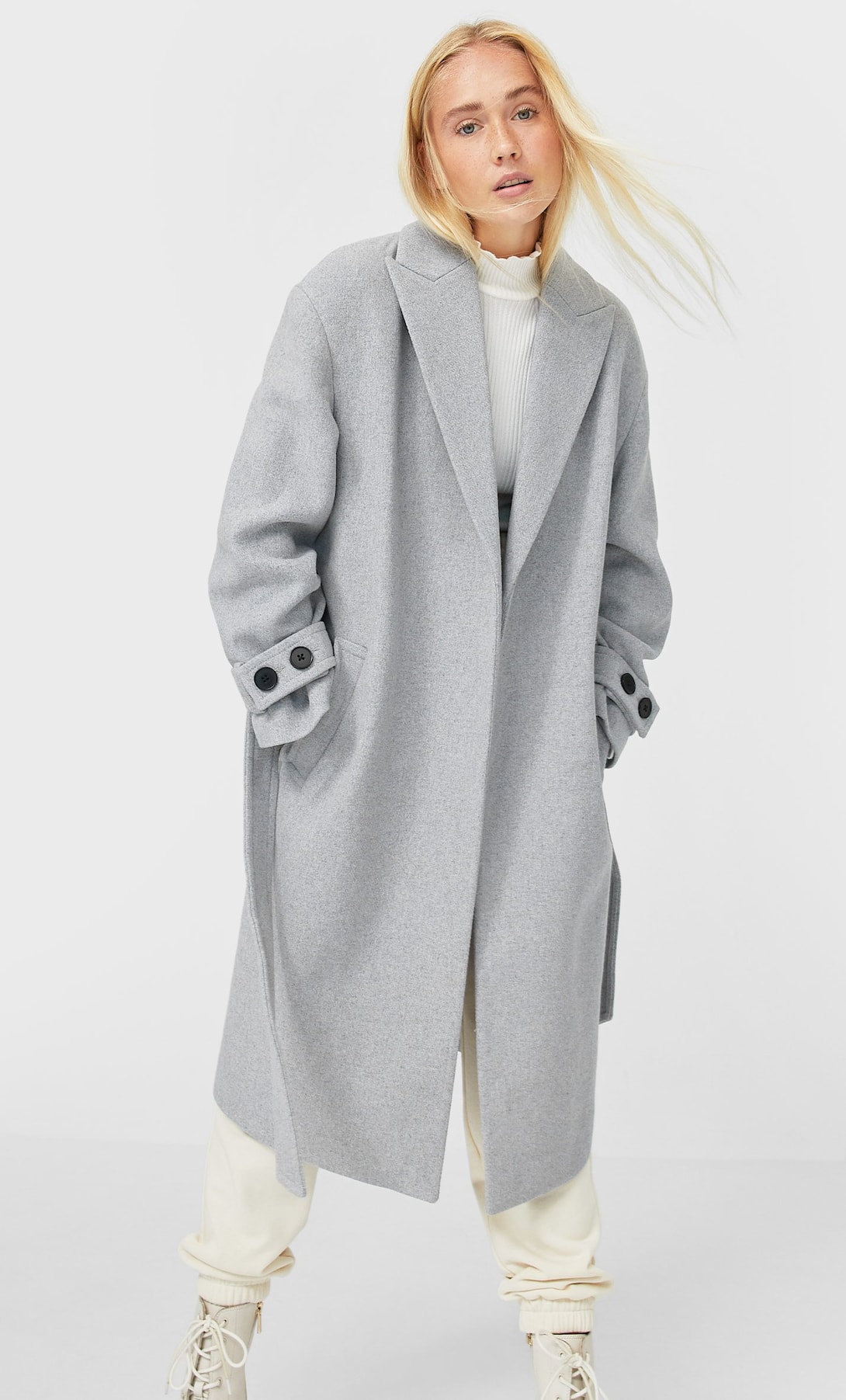 Este abrigo de Stradivarius tiene también cuello solapa y manga larga. A pesar de que no tiene botones o cremallera para su cierre, sí cuenta con un cinturón a tono. El precio de este abrigo es de 41,99 euros, y este es el enlace donde podrás encontrarlo.