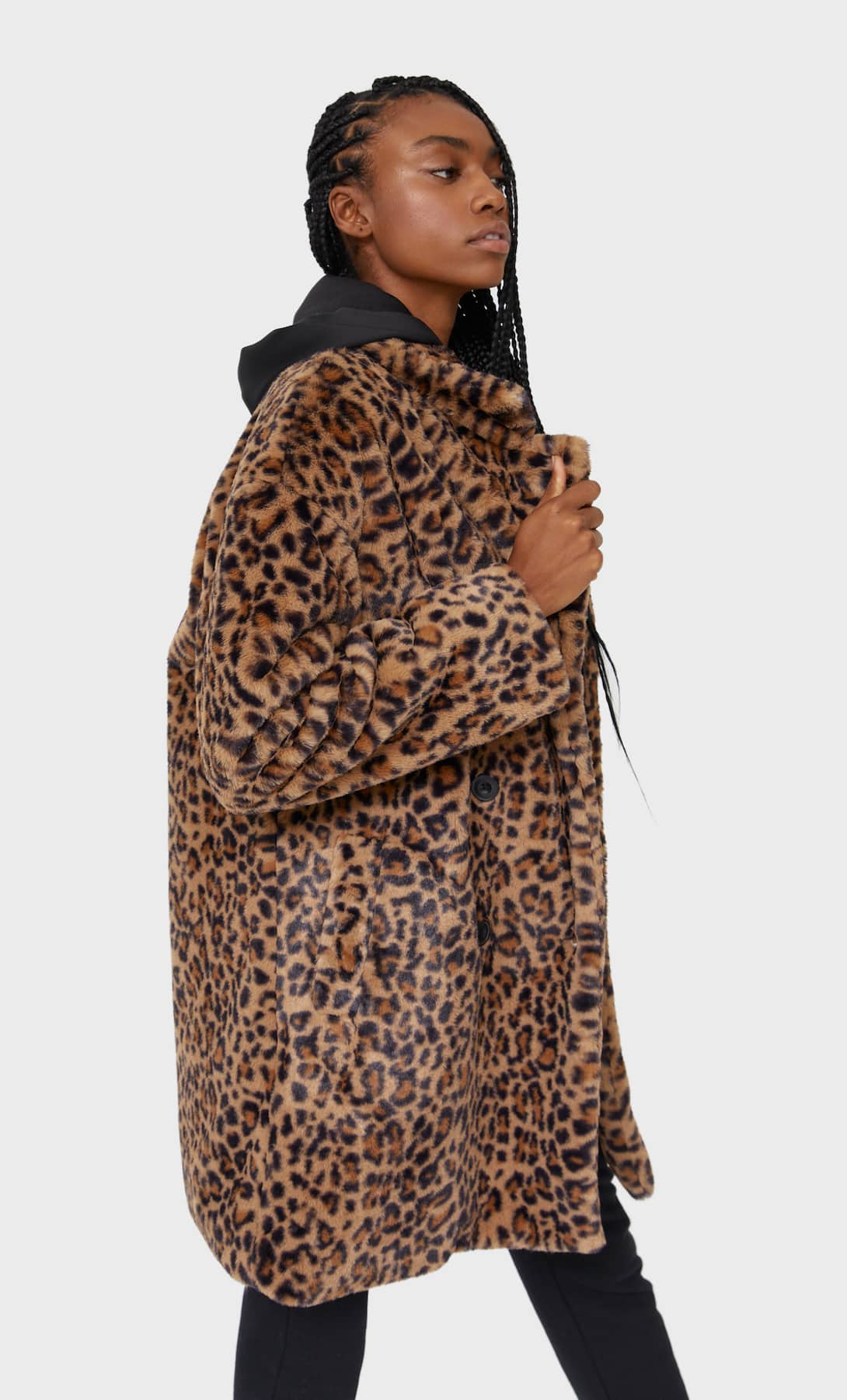 Como os decíamos, el animal print sigue presente en muchas firmas, y en Stradivarius tienen para ti otro modelo de abrigo con este mismo estampado.