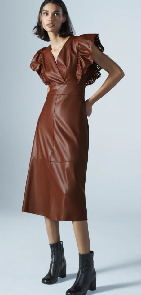 Seguimos con este vestido efecto piel de Zara. Es un vestido de color granate, con escote pico cruzado y manga sisa con volante. También destacan sus bolsillos laterales ocultos en la costura y el detalle de tejido perforado. En cuanto al cierre, es en espalda con cremallera.