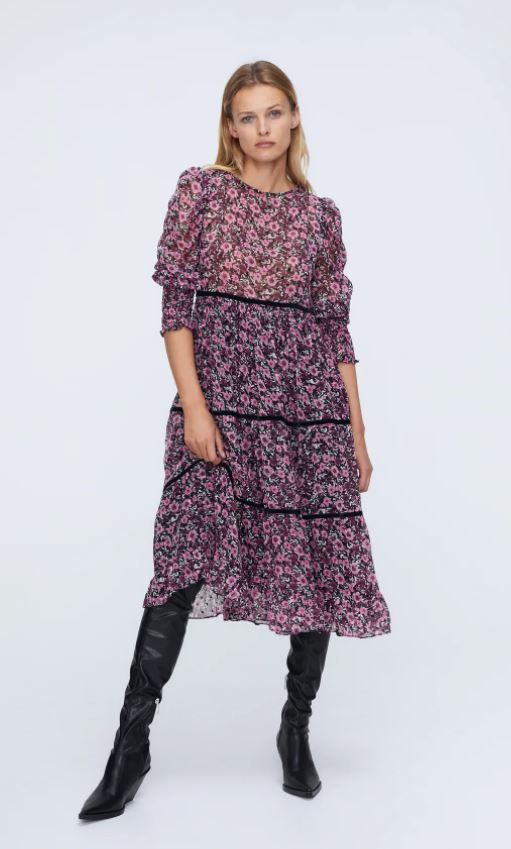 Ahora veremos un vestido midi con estampado multicolor. Es una prenda con cuello redondo y manga larga que acaba en un elástico tipo nido de abeja. Lo más destacado es el detalle de aplicación pasamanería con tejido en terciopelo, el forro interior y el cierre en la zona de la espalda con botón y abertura.