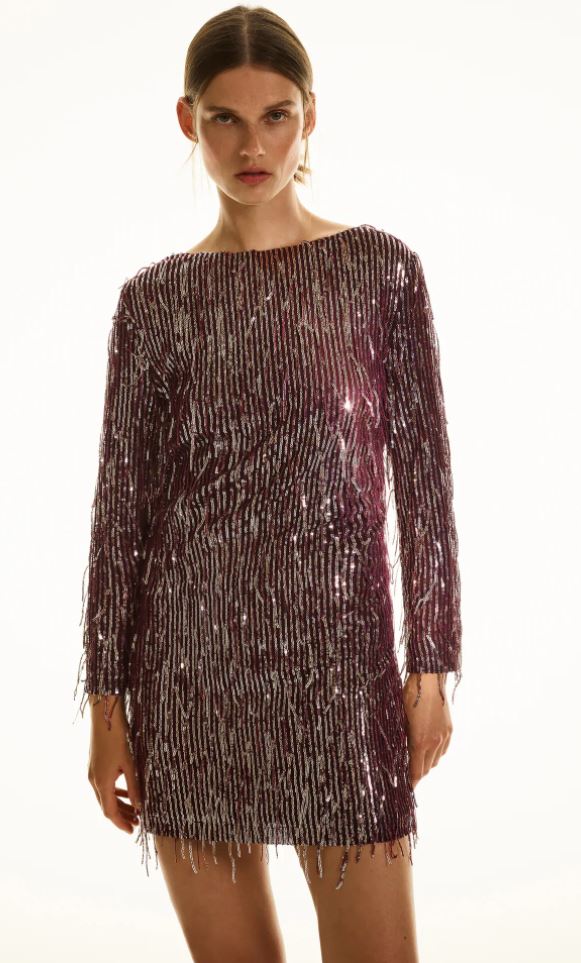 Ahora veremos este vestido de lentejuelas y flecos de venta en la empresa de Amancio Ortega. Es una prenda con cuello redondo y manga larga, con detalle de escote en espalda y de color burgundy. Está disponible en talla XS, S, M, L y XL.