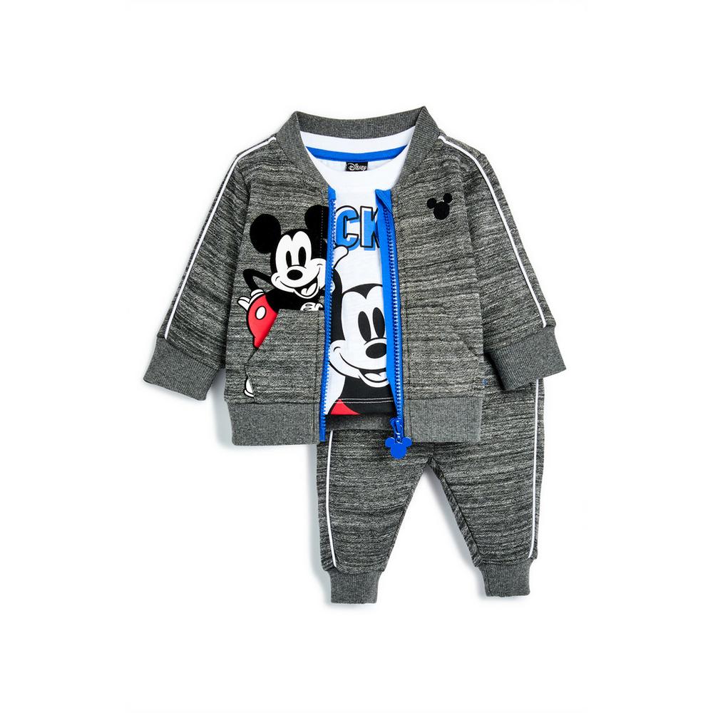 Se trata de tres piezas de chándal realmente adorables en las que la cara del personaje de Disney no duda en hacer presencia. Chaqueta gris con cremallera, pantalones a juego y una camiseta en color blanco, también con Mickey en su estampado.