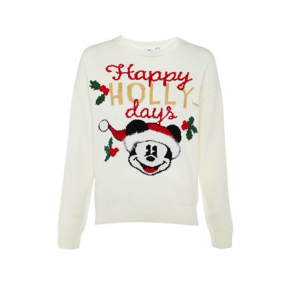 Se trata de un jersey en color crema y de punto con la frase «Happy Hollydays». También tiene bordada la cara del personaje de Disney y varios motivos navideños.