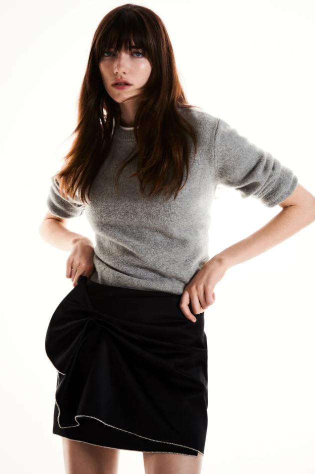 La última falda que veremos hoy es esta falda lazo strass. De nuevo, es de tipo mini con el tiro alto, aunque ahora tiene un detalle de lazo en la parte delantera. Asimismo, cuenta con acabados con aplicación joya y el cierre en la espalda con la cremallera oculta perfectamente en la costura.