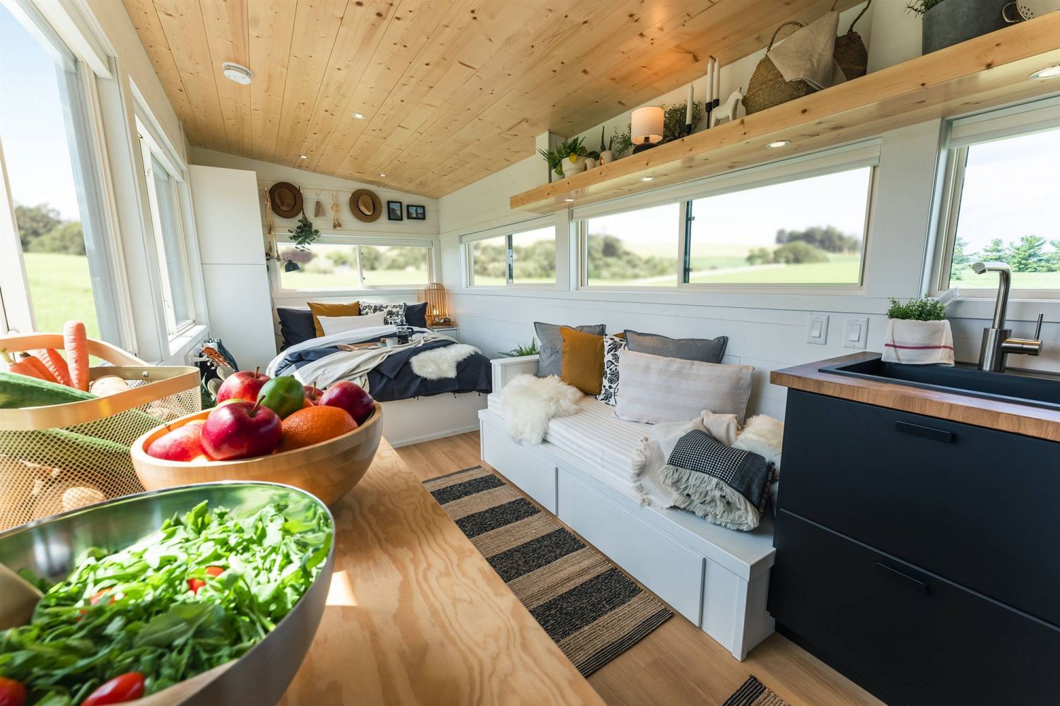 Los muebles de esta mini casa han sido fabricados con materiales reciclados, o bien de madera que ha sido cultivada de forma sostenible. Para crear un efecto de mayor amplitud, todos los muebles tiene colores en tonos claros. Entre el equipamiento de la casa, nos encontramos con que cuenta con luces LED de bajo consumo.