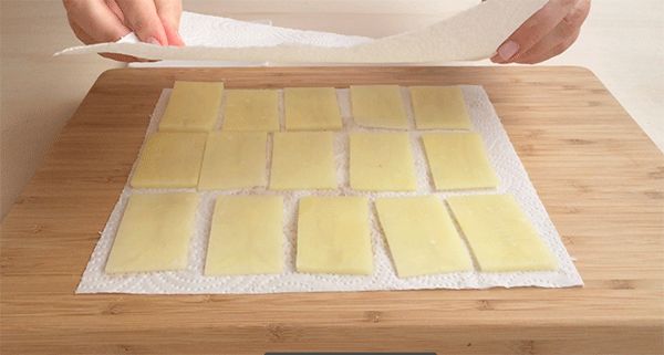 Lo primero de todo será cortar las patatas con una forma rectangular. El ancho debe ser de unos tres milímetros. En definitiva, ‘finas lonchas. Después hay que lavar bien cada trozo para que las patatas suelten todo el almidón que tengan. Las extendemos sobre papel absorbente para que suelten el exceso de agua. También secamos la parte de arriba, es un paso importante para que después se frían rápido y no se cuezan con el agua que suelten. Una vez estén cortadas y lavadas llega la parte importante y el secreto de los chefs para que las patatas se inflen y queden con esa forma tan característica.