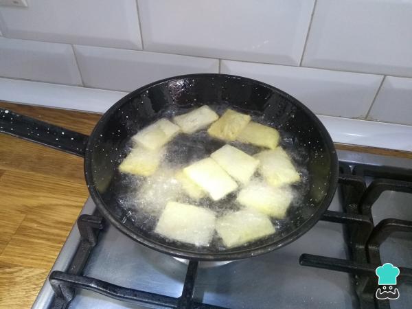 Lo primero de todo, deberemos echar abundante aceite de oliva en dos sartenes diferentes. La primera sartén deberá estar a una temperatura de 120ºC. El objetivo es que la patata no se tueste ni se cocine rápidamente, sino que se poche y se haga bien por dentro. Si ves que está demasiado caliente y la fritura es muy rápida, aparta la sartén del fuego.