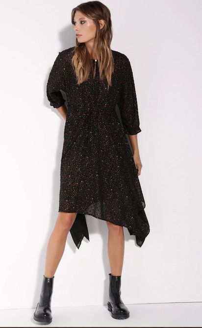 ¿Buscas un vestido diferente para una noche especial? ¿Y qué te lo puedas poner en invierno e ir guapa, sexy y abrigada a la vez? La marca Eloy, que es exclusiva de El Corte Inglés, nos ofrece este modelo de vestido de altura midi, de color negro con un estampado de fantasía. Es de manga larga y escote redondo y los bajos terminan de forma asimétrica con picos, aportándole un aire moderno y original.