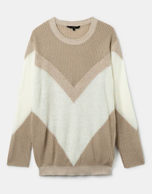 Si prefieres incorporar a tu colección de jerséis algún modelo que no sea de color liso, puedes elegir alguno de franjas o bloques, que son dos de los diseños más de moda esta temporada y que crean un efecto visual muy favorecedor. De la marca Elogy de El Corte Inglés, hemos encontrado este de colores beige y blanco, muy estiloso, con un fit ligeramente amplio y el bajo ajustado. Lleva un escote redondo y manga larga. Está fabricado con un 90% de algodón y 10% de lurex, así que tiene un tacto que encantará a las amantes de los tejidos más naturales. Tiene una rebaja ni más ni menos que del 50%, así que puede ser tuyo por solo 19,99€.
