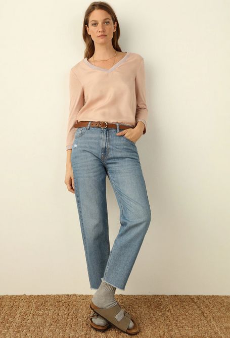 Tiene un cuello en forma de pico y lleva una franja en ligero contraste en los puños y en el escote. Está disponible en tres bonitos colores pastel: azul porcelana, musgo y rosa claro. Tiene un descuento del 33% y te la puedes llevar a casa por 19,99 €.