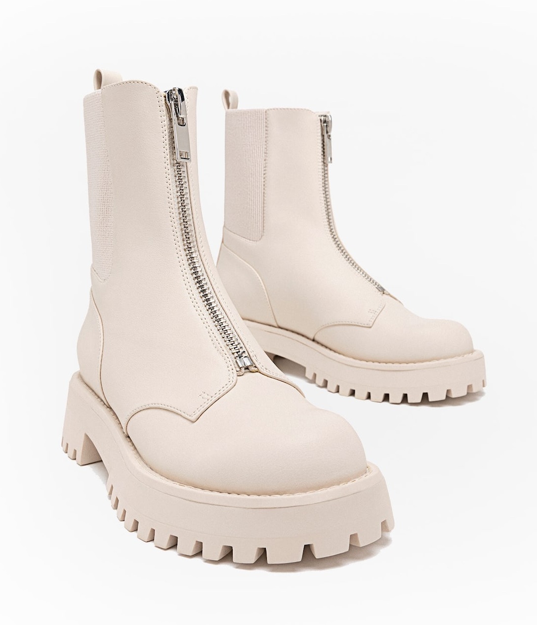 En cambio, estos botines de Stradivarius son en color crudo, y el detalle que destaca principalmente es su plataforma plana y la cremallera en la parte frontal. El precio de estos botines es de 39,99 euros, y este es el enlace donde puedes encontrarlos.