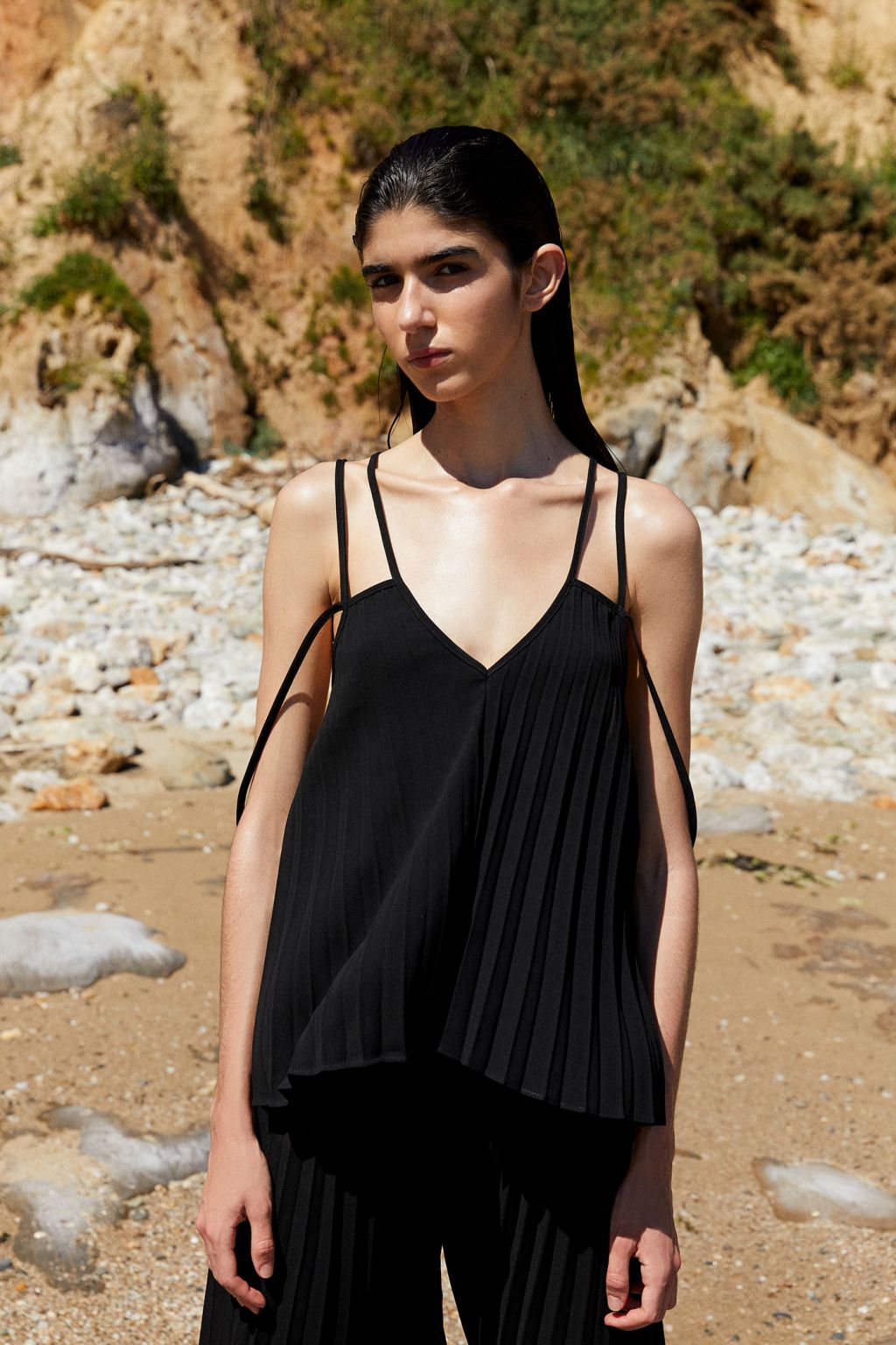 Pasamos a una camiseta de la nueva colección de Sfera, pues no todo son vestidos y pantalones. Esta en particular cuenta con un pantalón a conjunto para crear el efecto de un vestido, ya que es muy amplio. Pero si solo te interesa la parte superior, no tendrás problemas a la hora de buscar la forma de combinarlo.