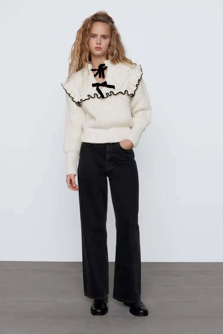 La siguiente prenda de invierno de Zara es este jersey de punto con lazos de color blanco y negro. Es un jersey de cuello redondo, con abertura ajustable con lazadas a contraste. Destaca su manga larga abullonada que acaba en puño y su detalle de volantes en la parte delantera y las mangas, además de los acabados en rib.