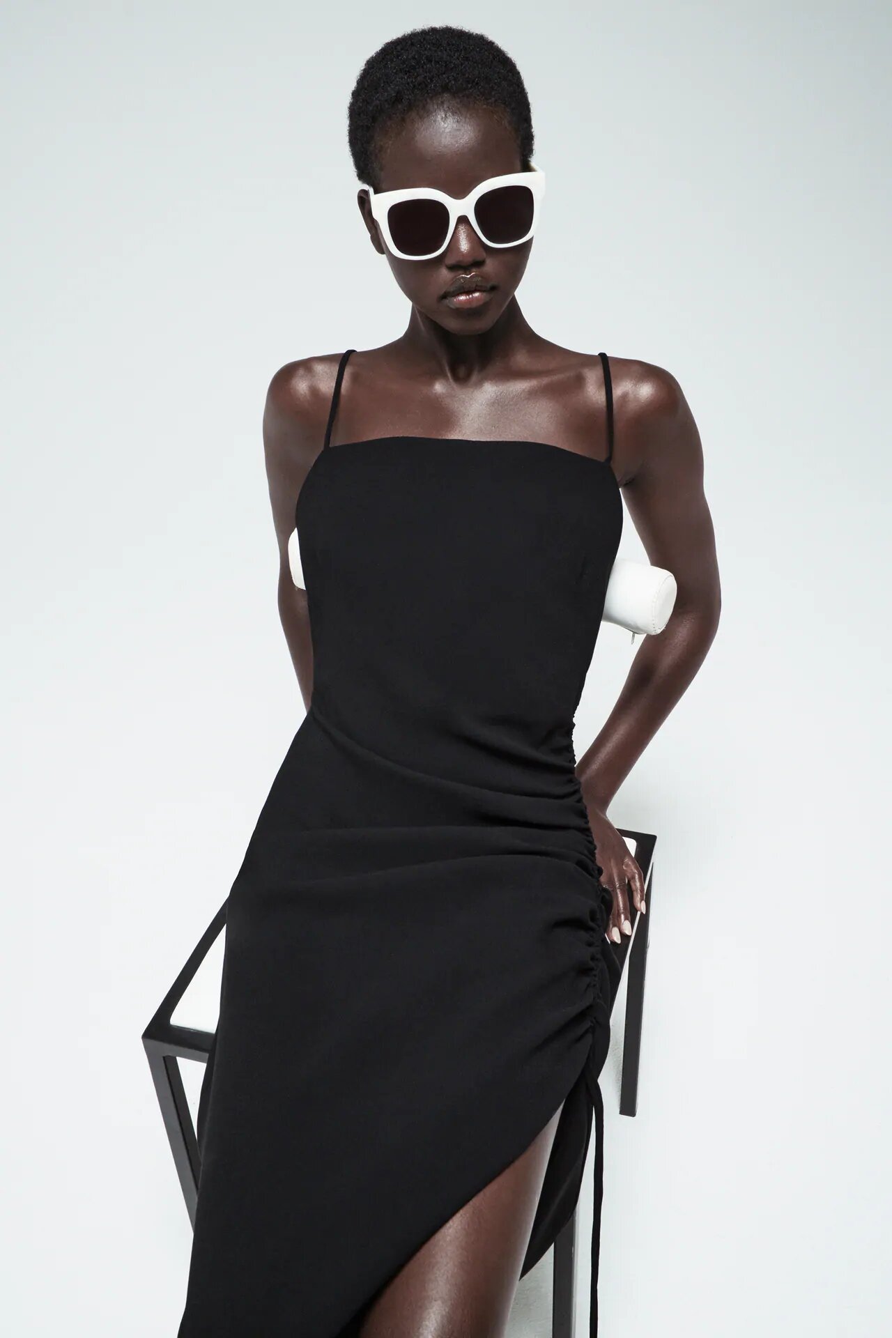 Prueba de ello lo tenemos en este vestido negro drapeado a un lado de la cadera, con cordones para ajustarlo y escote recto con tirantes finos. El precio del diseño es de 19,99 euros, y este es el enlace en el que vas a poder encontrarlo.