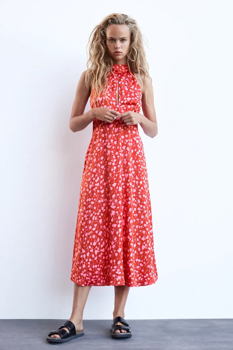 Continuamos con este vestido halter estampado de Zara de color rojo. Se trata de una prenda con lazada, detalle de abertura en pechera y cierre en espalda, teniendo la cremallera oculta en la parte de la costura.