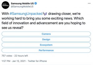 En este contexto, Samsung tuiteó desde @SamsungMobileUS un mensaje para promocionar el evento próximo de la marca, llamado Samsung Unpacked, usando para ello un teléfono móvil fabricado por uno de sus principales competidores. Es en el Samsung Unpacked, celebrado este jueves, donde presentaron su nuevo modelo Galaxy S21.