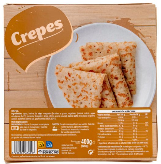 Uno de los postres que más asociamos a las gastronomía francesa son los crepes. En realidad, estos alimentos no dejan de ser unas tortitas finas elaboradas a partir de una masa compuesta por harina, leche, agua y huevos que también son típicas de distintos rincones de nuestra gastronomía, como en Asturias donde se denominan frixuelos. En Mercadona, tienen estos crepes envasados, y si bien podemos hablar de un postre delicioso y bastante energético, su consumo debería ser tan solo esporádico y ocasional, especialmente si no elegimos la opción casera que al menos nos aportará alguna vitamina extraída de la leche o los huevos. Los crepes del Mercadona tienen 550 calorías, es decir, más de un cuarto de la ingesta recomendada en una mujer media. Es para pensárselo, desde luego.